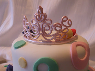 One of my regular clients had a 10th birthday in April - I call her the client since has called each year with her own order! This year, however, her mother wanted to surprise her and ordered a two tier princess cake, complete with edible make up and a gum paste tiara on the top.